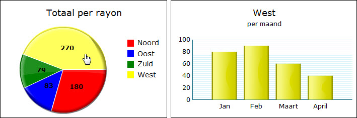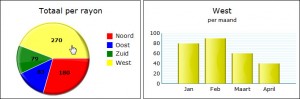 U kunt uw Xcelsius-grafieken voorzien van diepte-analyse. Door bijvoorbeeld in een cirkeldiagram op een ’taartpunt’ te klikken die staat voor een bepaald rayon ( Noord, Oost, Zuid of West ) worden in een kolomdiagram details van dat rayon getoond. Door dynamische kleuren te gebruiken zorgt u ervoor dat de kleur van de serie in het kolomdiagram dezelfde is als de gekozen taartpunt.