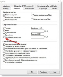 – Onder het tabblad Database schakelt u de optie Opgeslagen Procedures (stored procedures) UIT.